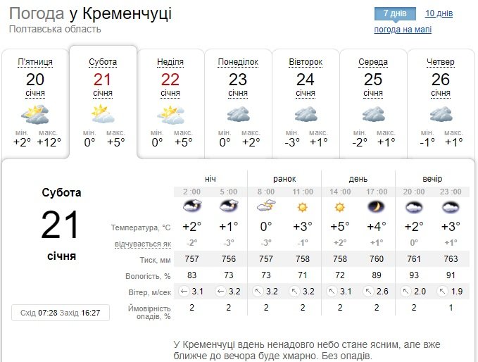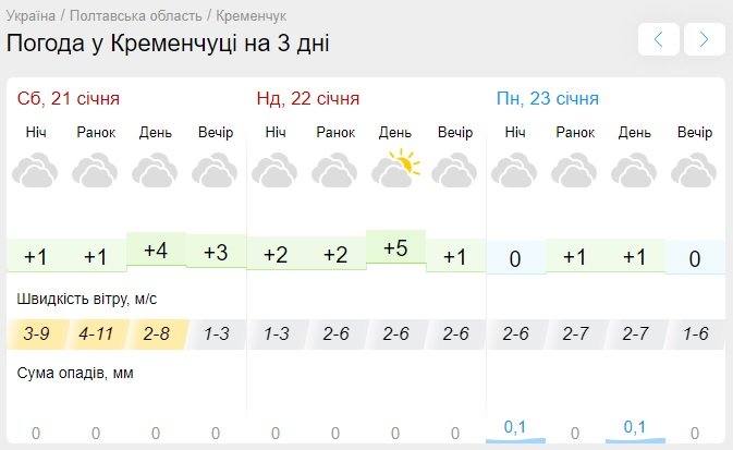 Ventusky обіцяє цілковито похмуру погоду у суботу, 21 січня, і лише короткочасне прояснення вдень у неділю, 22 січня. У суботу сила вітру сягне 20 км/год. Повітря прогріється до позначок від 0°С до +3°С.