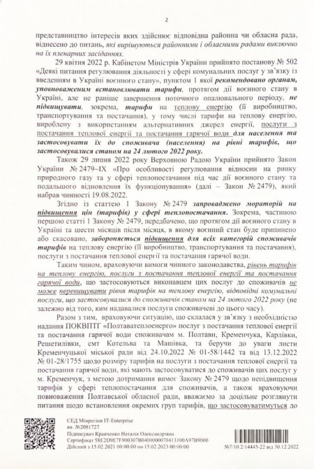 І хоча дійсно, ПОКВПТГ «Полтаватеплоенерго» може окремо для Кременчука й не розробляти індивідуальні тарифи (відмінні за ті, які діють у Полтаві, Карлівці, Решетилівці, Котельві та Машівці, які обслуговує «ПТЕ»), як на цьому й наголошували представники цього підприємства, все ж враховуючи Постанову КМУ від 29 квітня 2022 р. №502 «Деякі питання регулювання діяльності у сфері комунальних послуг у зв’язку із введенням в Україні воєнного стану» та ст. 1 Закону України від 29.07.2022 №2479-IX «Про особливості регулювання відносин на ринку природного газу та у сфері теплопостачання під час дії воєнного стану та подальшого відновлення їх функціонування» рівень тарифів на теплову енергію, послуги з постачання теплової енергії та постачання гарячої води, що застосовуються виконавцем цих послуг до споживачів не може перевищувати рівня тарифів на теплову енергію, відповідні комунальні послуги, що застосовувалися до споживачів станом на 24 лютого 2022 року (не залежно від того, ким надавалися послуги споживачеві до цього часу).