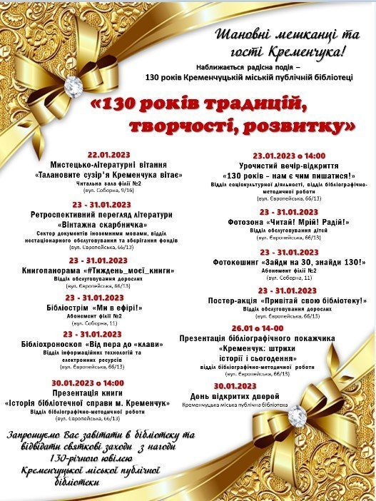 Як і завжди впродовж усіх 130 років, Кременчуцька міська публічна бібліотека гостинно запрошує своїх користувачів до різноманітного світу друкованого слова, йдучи в ногу з сучасністю до всесвітньої цифрової спільноти.