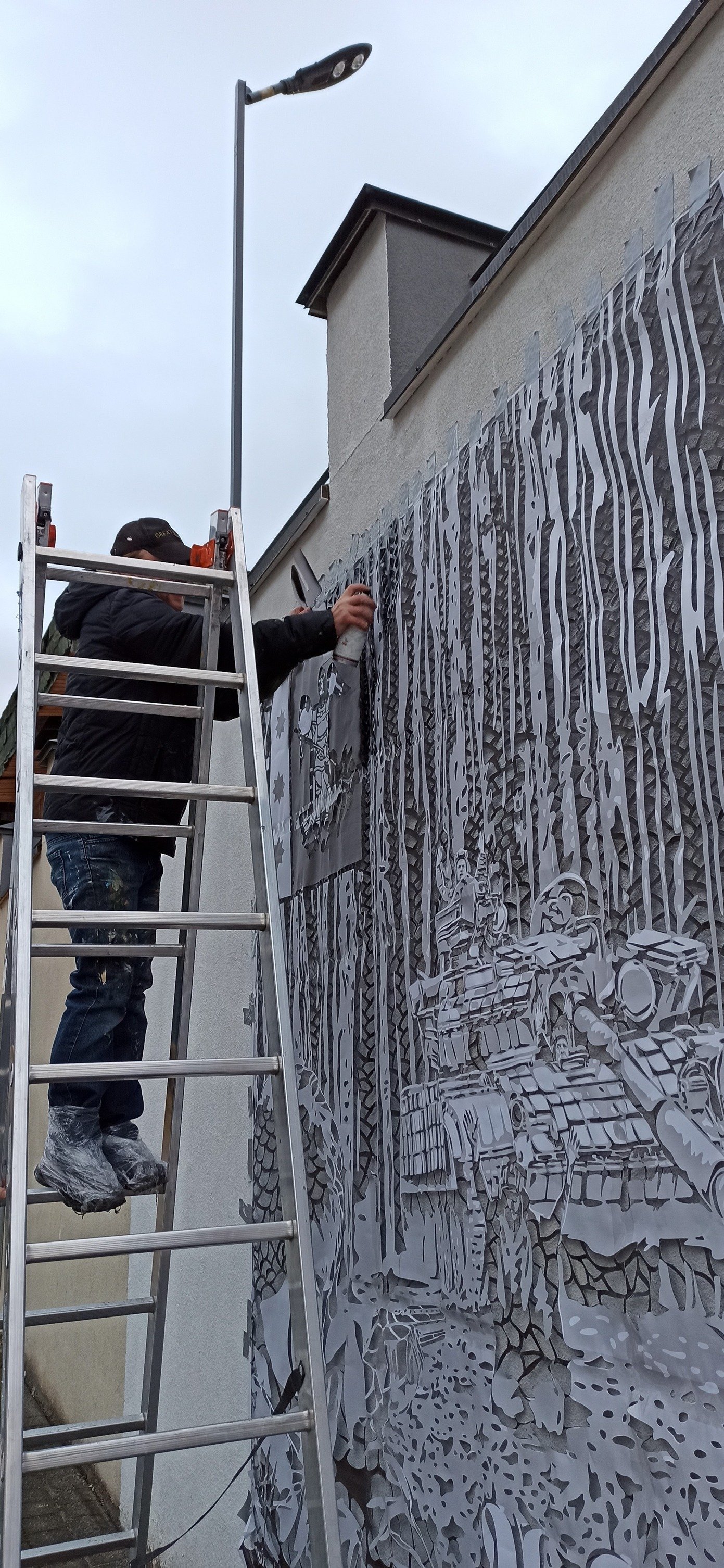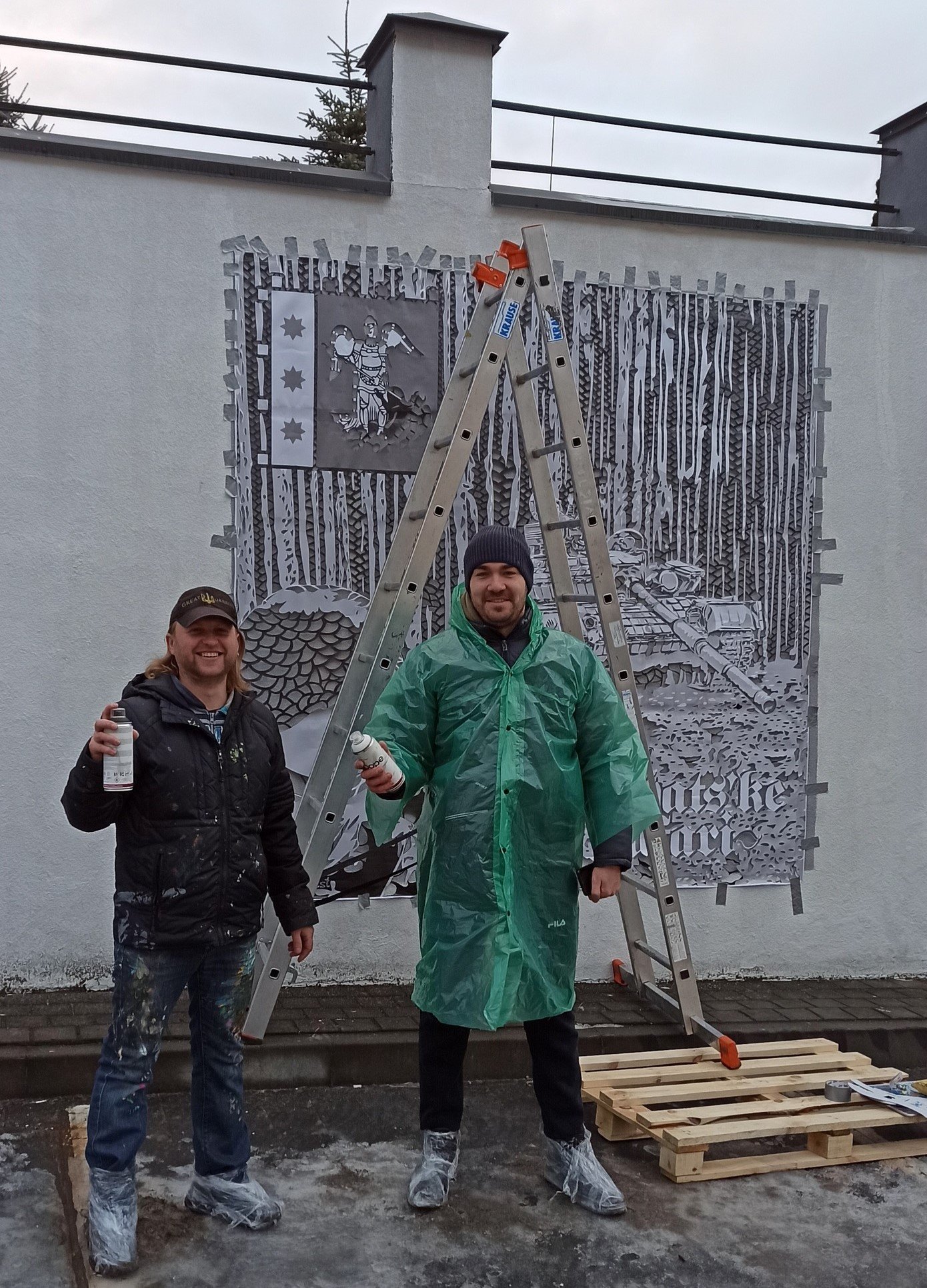 — У Львові нас добре зустріли організатори, ми завантажили речі в автівку та поїхали на об’єкт. Було доволі рано, навіть сонце ще не зійшло. Поки ми розпакували торби, дістали матеріали та переодяглись у те, що можна забруднити фарбою, розвиднилося повністю.