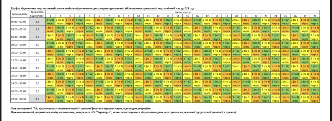 З‘явився новий графік відключення електроенергії на лютий з можливістю відключення двох черг одночасно. Про це повідомили в АТ «Полтаваобленерго».