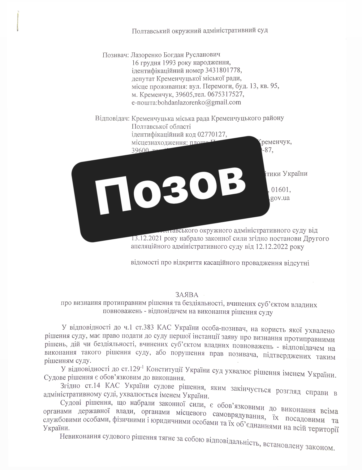 Депутат Кременчуцької міської ради Богдан Лазоренко звернувся з позовною заявою до Полтавського окружного адміністративного суду, про визнання протиправним рішення та бездіяльності, вчинених суб’єктом владних повноважень-відповідачем на виконання рішення суду.