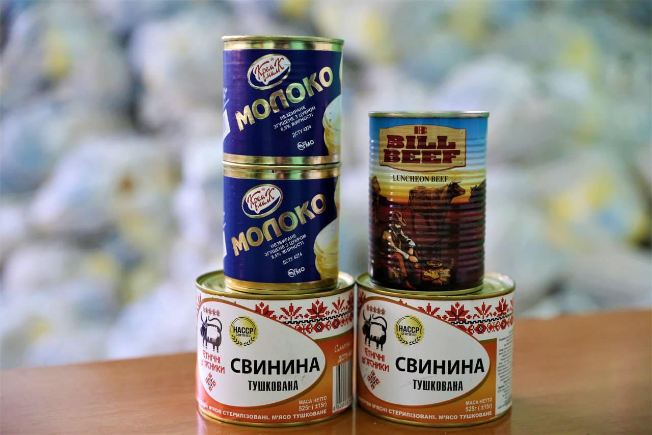 До наборів входять крупи, макаронні вибори, м’ясні та молочні консерви, олія, печиво.
