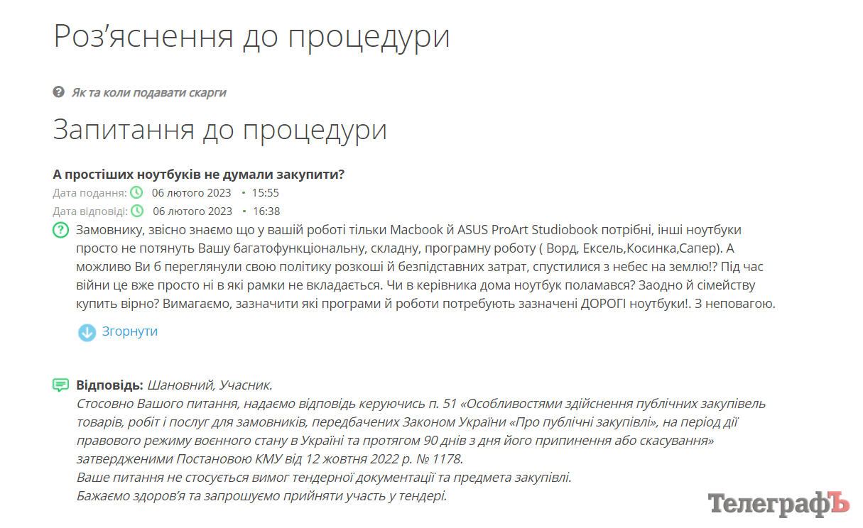 Один з потенційних учасників закупівлі у запитаннях до процедури попросив серед іншого зазначити, які програми й роботи потребують зазначені ноутбуки. Однак у КП відповіли, що це питання не стосується вимог тендерної документації та предмета закупівлі.