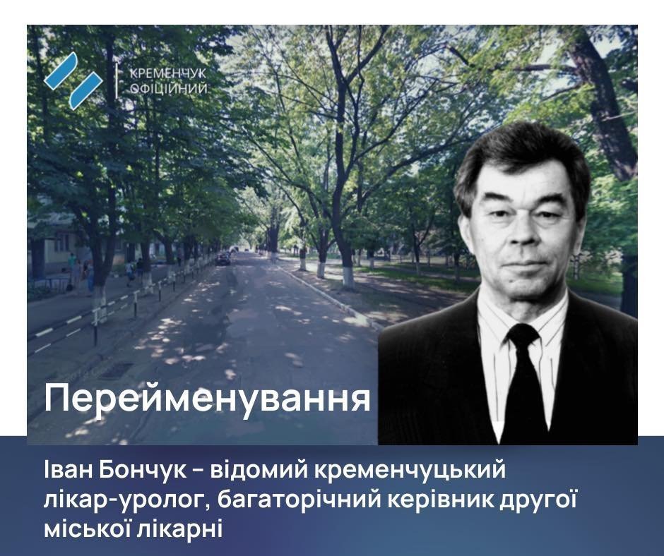 Вулицю Генерала Манагарова перейменували на честь відомого лікаря-уролога Івана Бончука Іван Іванович Бончук – відомий кременчуцький лікар-уролог, багаторічний керівник другої міської лікарні.