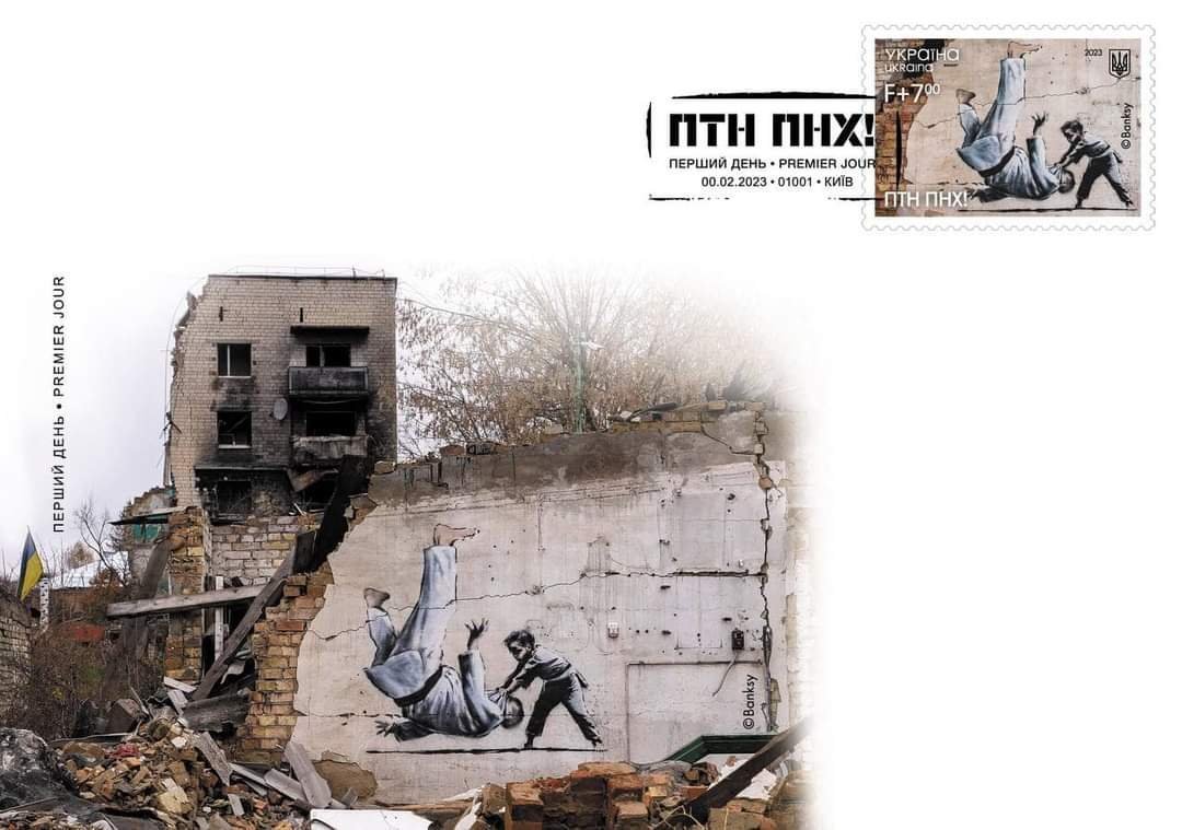 Цього разу для марки використали арт відомого художника Бенксі, який він залишив на руїнах будівлі у Бородянці. Це майбутнє України майбутнє — хлопчик, обов’язково переможе минуле, яке засіло в голові хворого диктатора і всіх, хто його підтримує. Давид переможе Голіафа.
