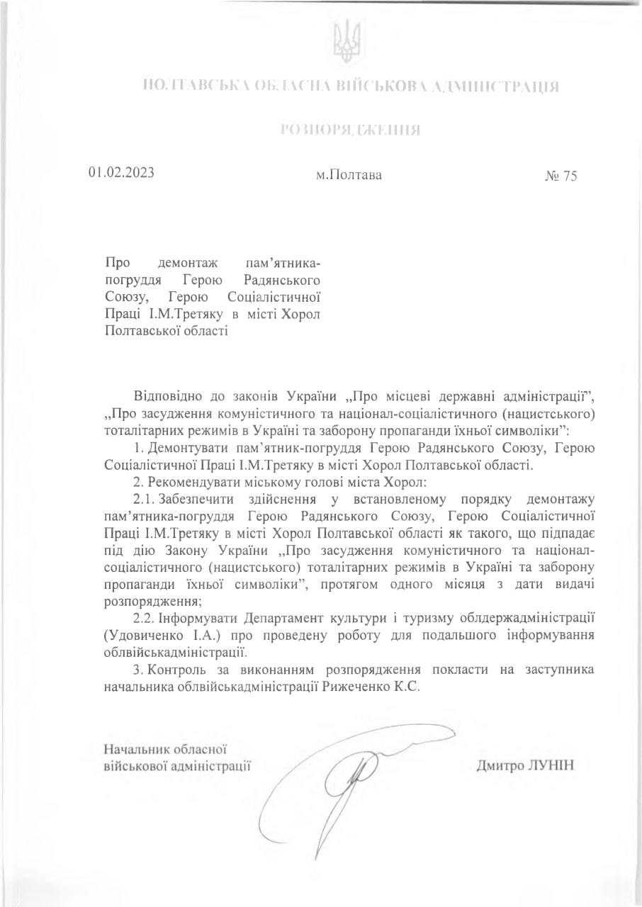 Демонтажні роботи провели вранці 25 лютого на виконання розпорядження начальника Полтавської обласної військової адміністрації Дмитра Луніна №75 «Про демонтаж пам’ятника–погруддя герою Радянського Союзу, герою соціалістичної праці І.М.Третяку в місті Хорол Полтавської області».