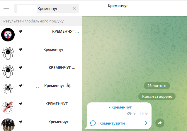 А вже вчора, 26 лютого, у соцмережах було створено близько 10 груп з «павуками», що мають прив’язку до Кременчука. В одних набивали кількість підписниками, в іншій — надали інформацію про збір сьогодні, 27 лютого, у сквері Бабаєва у зазначений час.