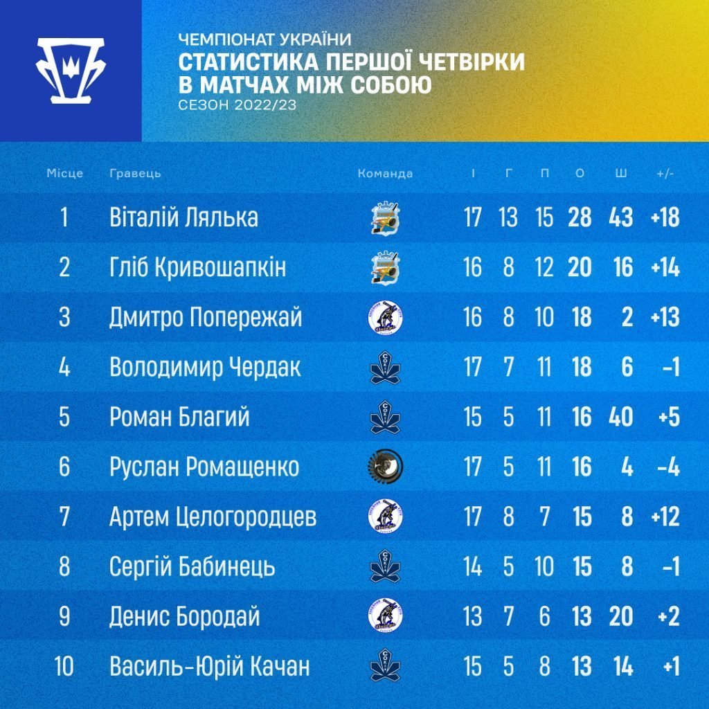 Загалом у чемпіонаті один із лауреатів вже визначився. Віталій Лялька (капітан ХК «Кременчук») напевне забере приз найкращому бомбардиру регулярного чемпіонату. Але якщо відкинути матчі проти «Києва» та «Берсерків», то картина найкращих бомбардирів матиме цікавий вигляд.