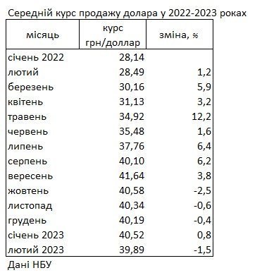 У лютому 2023 року середній курс продажу готівкового долара в Україні впав до 39,89 грн. У березні цей тренд продовжується. Курсу продажу долара нижче 40 грн в Україні не було з липня минулого року.