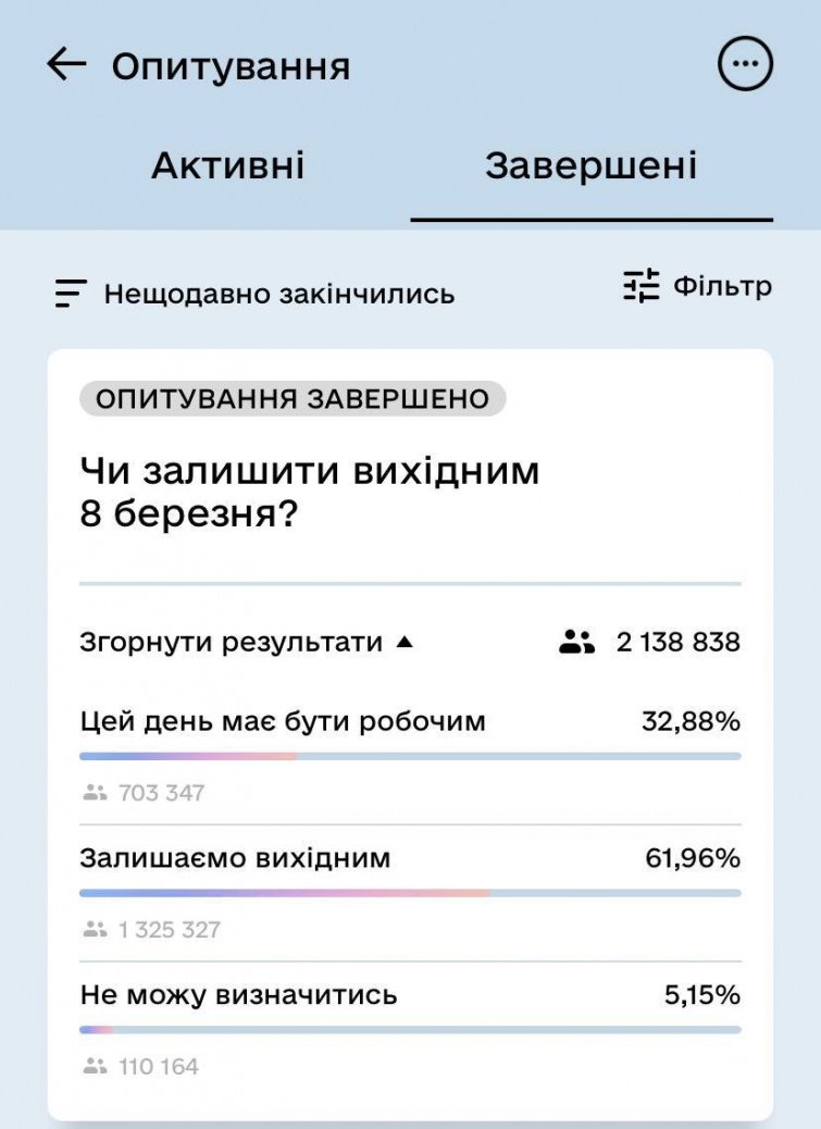 - 1,3+ млн користувачів проголосували за те, щоб залишити 8 березня вихідним (61,96%);