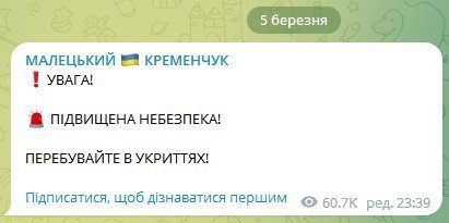 Вчора, 5 березня, о 21.00 на Полтавщині оголосили повітряну тривогу.