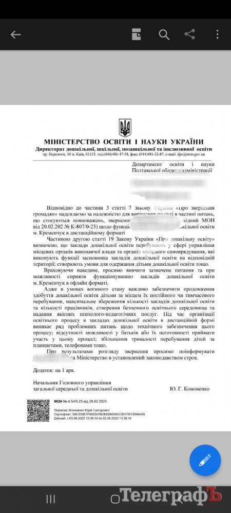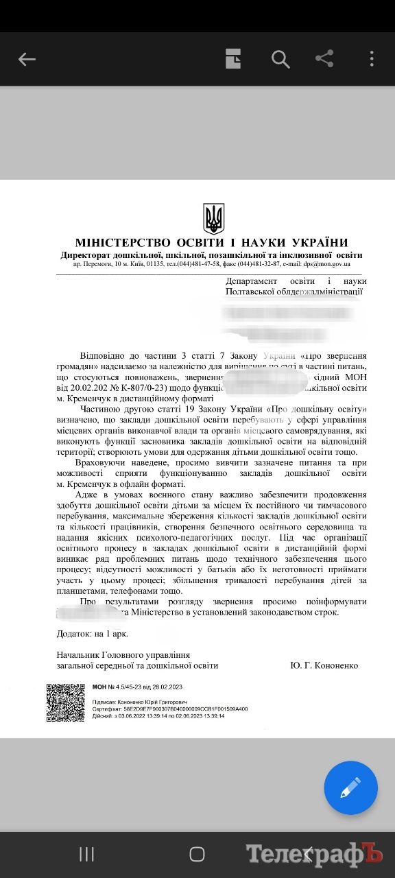 Як стало відомо «Кременчуцькому Телеграфу», нещодавно вони звернулися до Міністерства освіти з проханням розв'язувати це питання. Лист із підписами Міністерство освіти перенаправило до департаменту освіти Полтавської обласної адміністрації.