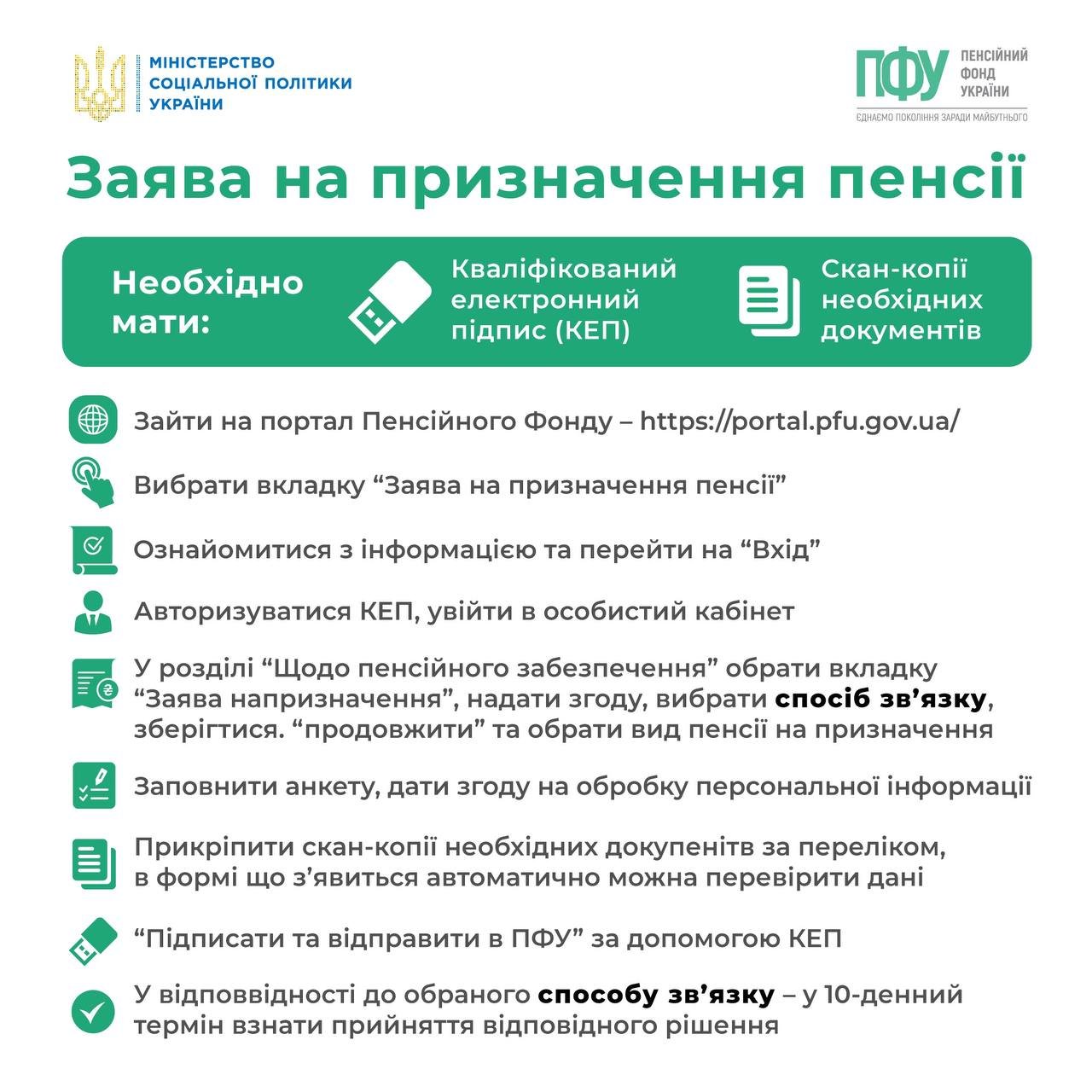Для цього потрібно зайти на вебпортал і вибрати вкладку «Заява про призначення пенсії», ознайомитись з інформацією, яка з’явиться на екрані, і потім перейти за посиланням «Вхід».