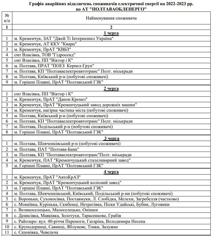 За розпорядженням НЕК «Укренерго», 14 березня з 10.11 в Полтавській області застосували графік аварійних відключень з 1 по 4 чергу. Про це повідомляє «Полтаваобленерго».