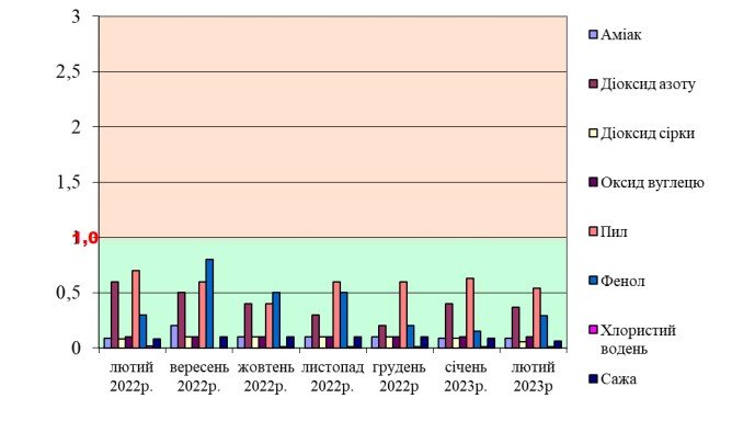 Середньомісячні концентрації забруднювальних речовин не перевищували гранично допустимих значень. У лютому перевищень за максимально разовою граничною концентрацією не зафіксовано.