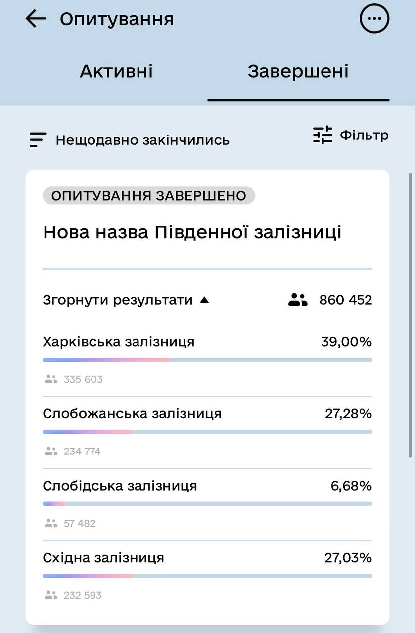 Українці обрали в «Дії», як перейменувати Південну залізницю, яка включає і Полтавщину. За інформацією Міністерства цифрової трансформації України, найбільше голосів набрала назва Харківська залізниця. Усього в опитуванні взяли участь понад 860,4 тисячі користувачів.