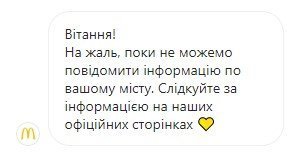 – На жаль, поки ми не можемо повідомити інформацію по вашому місту. Слідкуйте за інформацією на наших офіційних сторінках.