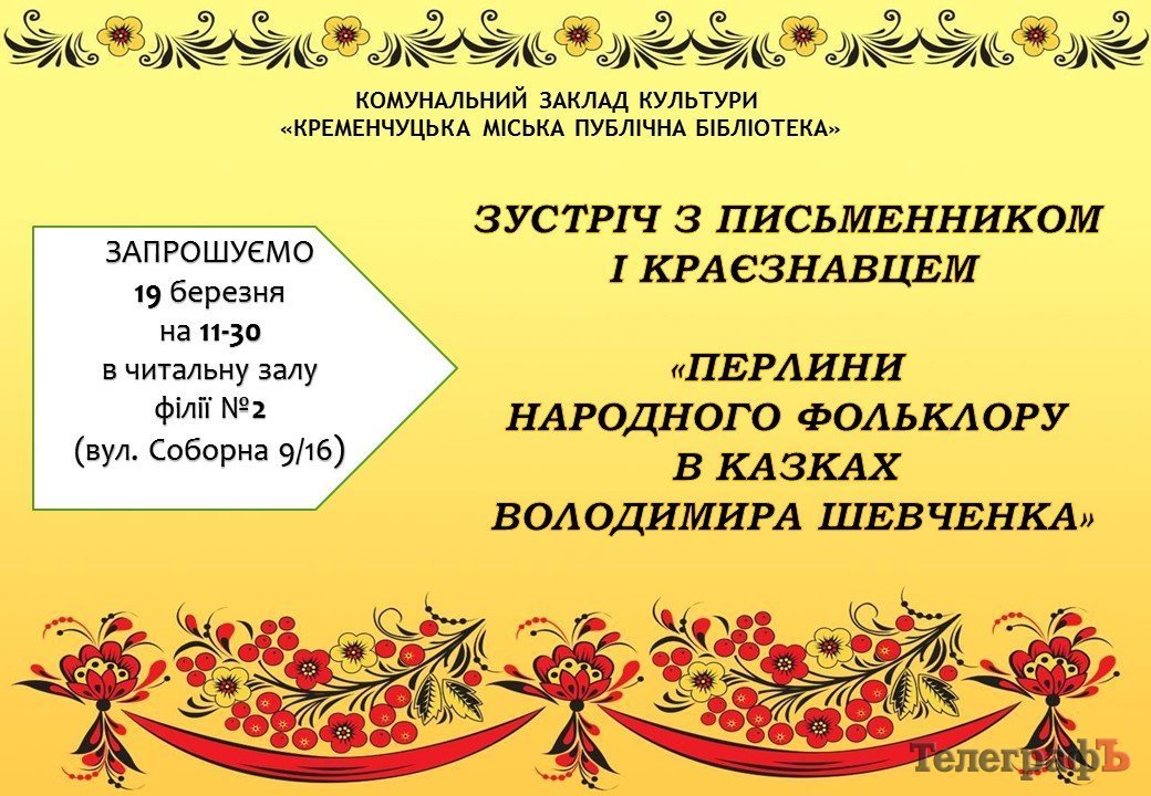 19 березня у читальній залі бібліотеки-філії №2 на Соборній, 9/16 відбулася презентація тритомного видання Володимира Шевченка «Казки й легенди Пивихи». Для понад 40 кременчужан і гостей міста, які цікавляться краєзнавством і минувшиною Кременчуччини, автор розповів історію написання книги та надав вичерпні відповіді на численні запитання.