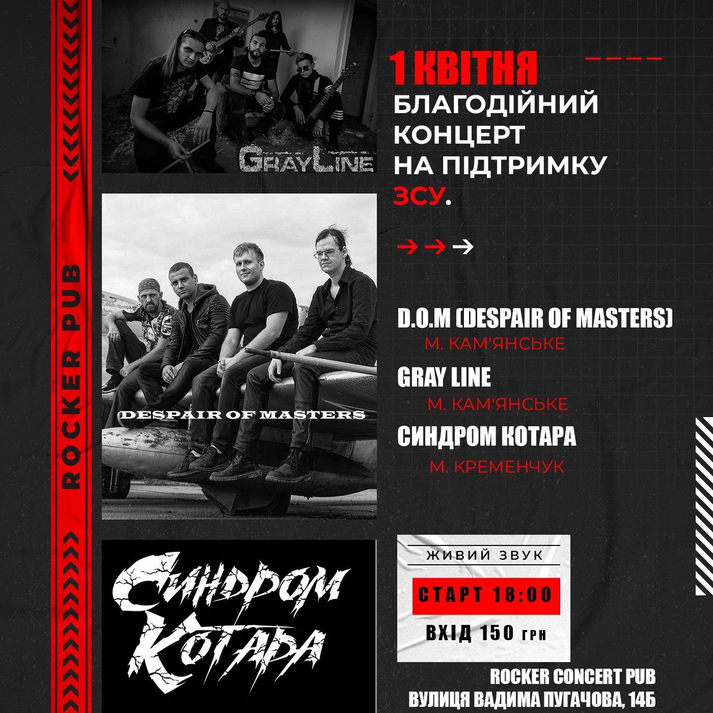 Виступатимуть гурти з Кам’янського D.O.M. (Despair of masters) і GrayLine, а також місцева команда Синдром Котара.