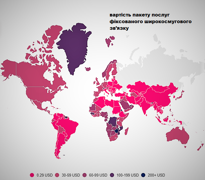 Україна посіла 6-те місце у рейтингу із середньою вартістю пакета послуг — $7,87 за 1 місяць (на основі 17 проаналізованих пакетів).