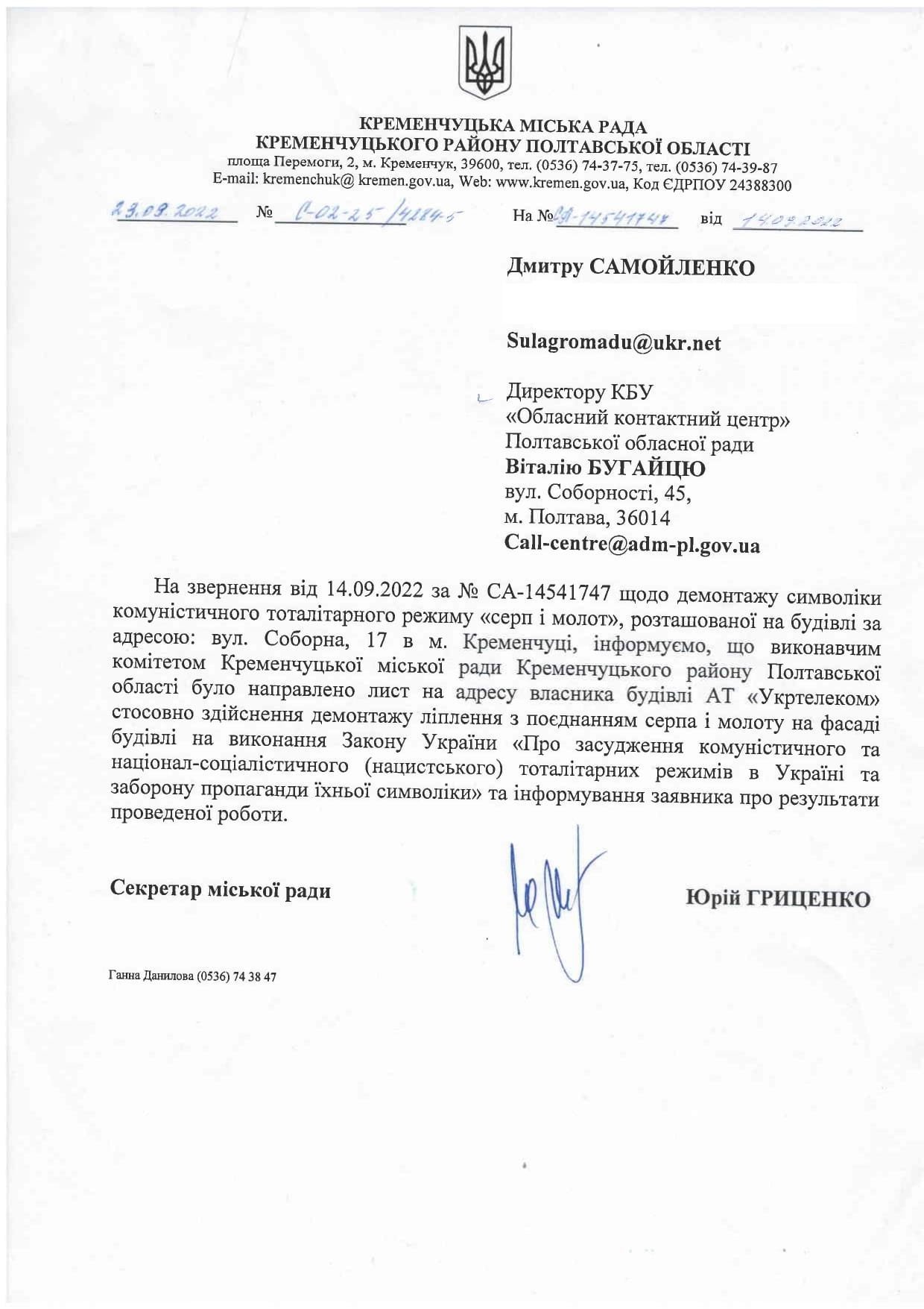 Про це свідчить відповідь АТ «Укртелеком» жителю Кременчука Дмитру Самойленку, який у вересні 2022 року звертався до Урядового контактного центру щодо демонтажу комуністичної символіки на фасаді будинку по вул. Соборній, 17.