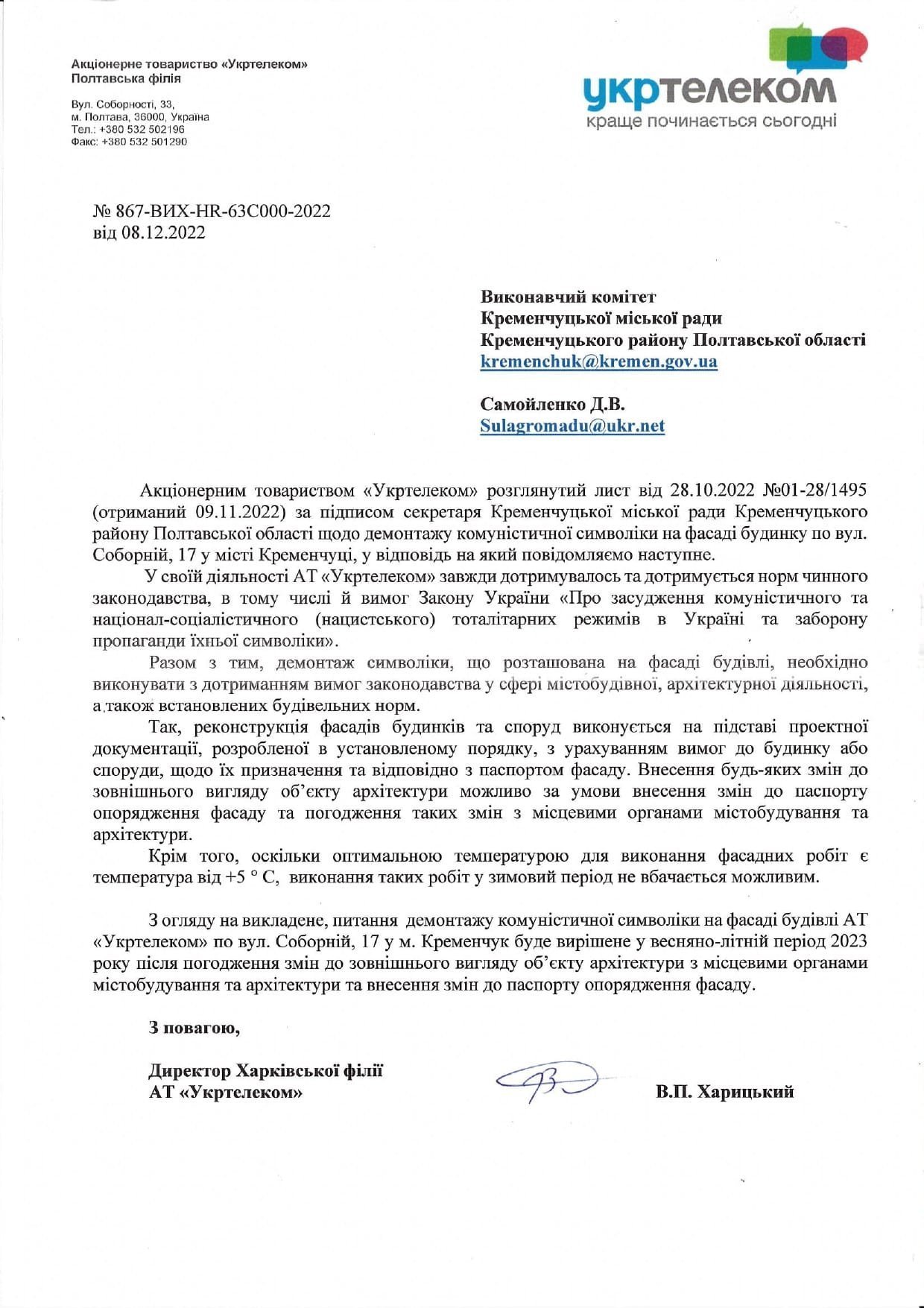 З огляду на викладене, питання демонтажу комуністичної символіки на фасаді будівлі АТ «Укртелеком» по вул. Соборній, 17 у м. Кременчук буде вирішене у весняно-літній період 2023 року після погодження змін до зовнішнього вигляду об’єкта архітектури з місцевими органами містобудування та архітектури та внесення змін до паспорта опорядження фасаду».