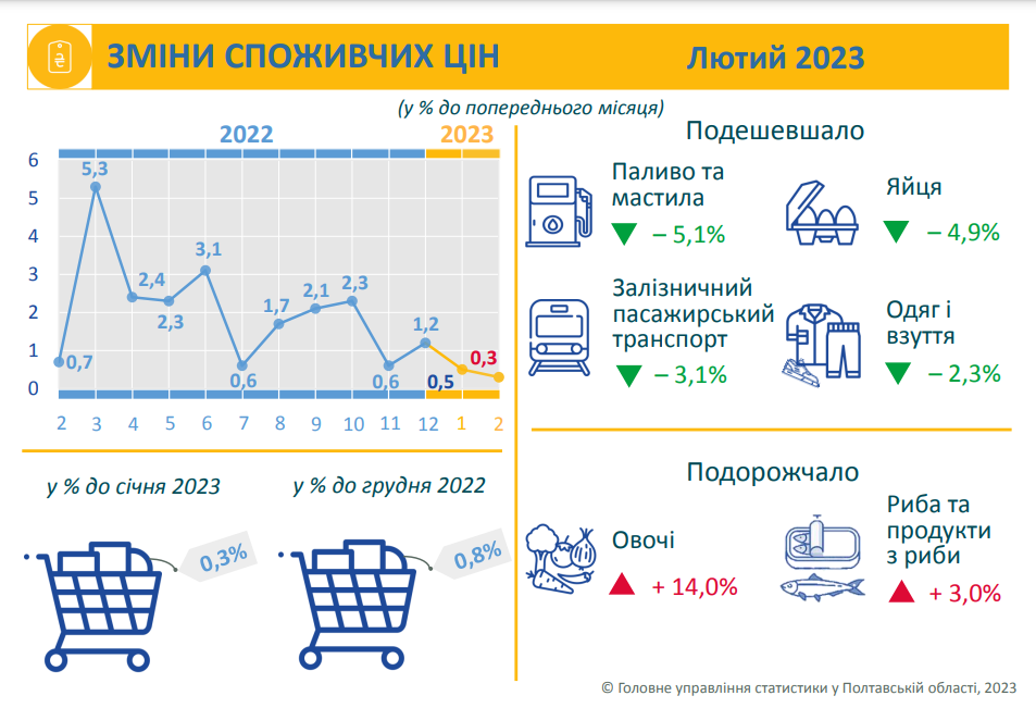 Управління статистики в Полтавській області оприлюднило ціни на споживчому ринку в лютому 2023 року у порівнянні з січнем. За їх даними, ціни по області зросли на 0,3%, з початку року — на 0,8%, по Україні — на 0,7% та 1,5% відповідно.