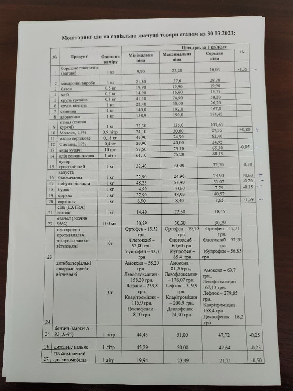 Так, протягом минулого тижня подорожчало молоко (середня ціна — 27,35 гривні), капуста (середня ціна — 23,90 гривень). Тим часом знизилися ціни на борошно (середня ціна — 16,05), яйця (середня ціна — 65,30), цукор (середня ціна — 32,70), цибулю (середня ціна — 51,07).