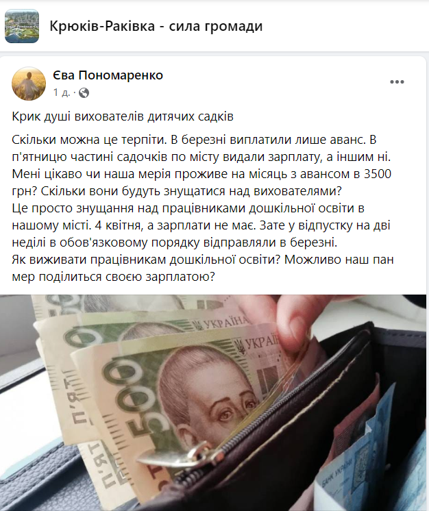 Подібні пости вихователів є й у соціальних мережах. Педагоги скаржаться, що вижити на 3,5 тисячі зараз — дуже важко, тим часом педагогів відправили у відпустку на два тижні в обов’язковому порядку відправляли в березні.