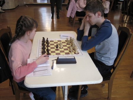 Ще активніше свою наступну партію білим кольором почав Є.Любченко, пожертвувавши пішака за активність у партії з Поліною Бондаренко, але не врахував, що замість того, щоб оборонятися, вона почне атакувати й виграє 2 у пішака. Вставши перед вибором довгострокової оборони чи атаки, Женя вибрав останнє, віддавши й 3-го пішака, а потім і туру, повністю розкриваючи позицію чорного короля і весь час погрожуючи матовою атакою. Але і сама Поліна весь час шукає можливість зустрічної атаки, прагнучи до виконання 3-го розряду, який буквально вислизав неодноразово у неї прямо з рук і в вихорі атак знаходить можливість рамена ферзів, човнів і слонів, звівши нанівець атакуючий потенціал білих. У результаті партія перетворюється на турове закінчення з трьома зайвими пішаками біля Поліни й слоном проти коня. Євген вирішується на жертву коня, прагнучи пройти пішки у ферзі, але після її блокування слоном і вже не утримуваного руху у ферзі чорного пішака визнає свою поразку.