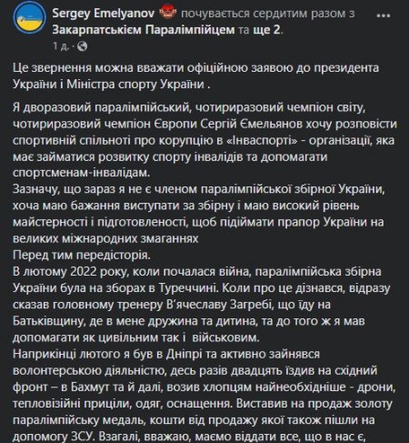 Я дворазовий паралімпійський, чотириразовий чемпіон світу, чотириразовий чемпіон Європи Сергій Ємельянов хочу розповісти спортивній спільноті про корупцію в «Інваспорті» - організації, яка має займатися розвитку спорту інвалідів та допомагати спортсменам-інвалідам.