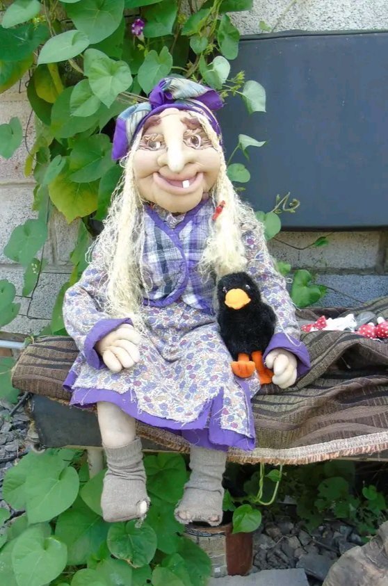 Ще одна улюблена робота — Баба Яга. Для неї жіночка теж довго шукала матеріали. Хотіла, щоб все було схоже на ношений одяг, щоб на сукні малюнок був дрібний.