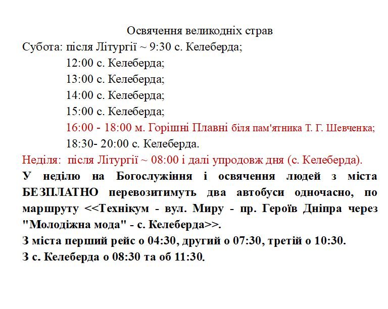 Настоятель Спасо-Преображенського храму ПЦУ с. Келеберда та Петропавлівської релігійної громади Горішніх Плавнів о. Миколай (Гандзюк) запрошує жителів Горішньоплавнівської громади - парафіян Православної Церкви України (ПЦУ) освятити великодні страви 15 та 16 квітня. Про це він повідомив на своїй facebook-сторінці.