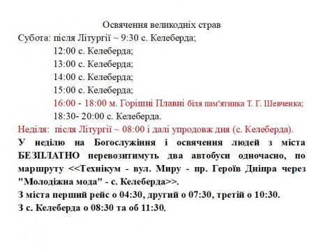 У Келеберді усі охочі зможуть освятити паски та інші великодні страви (споживати освячені страви можна в неділю):