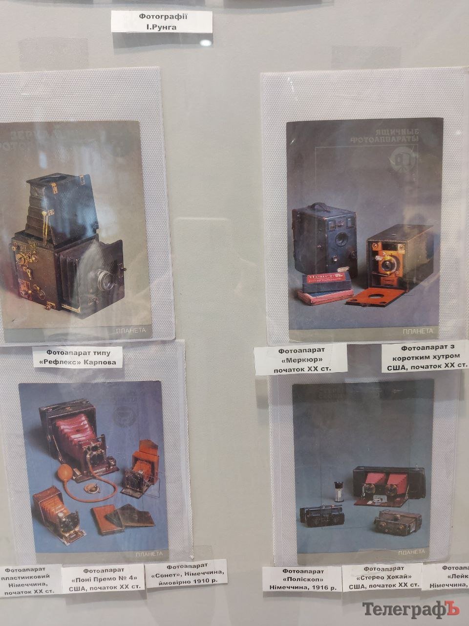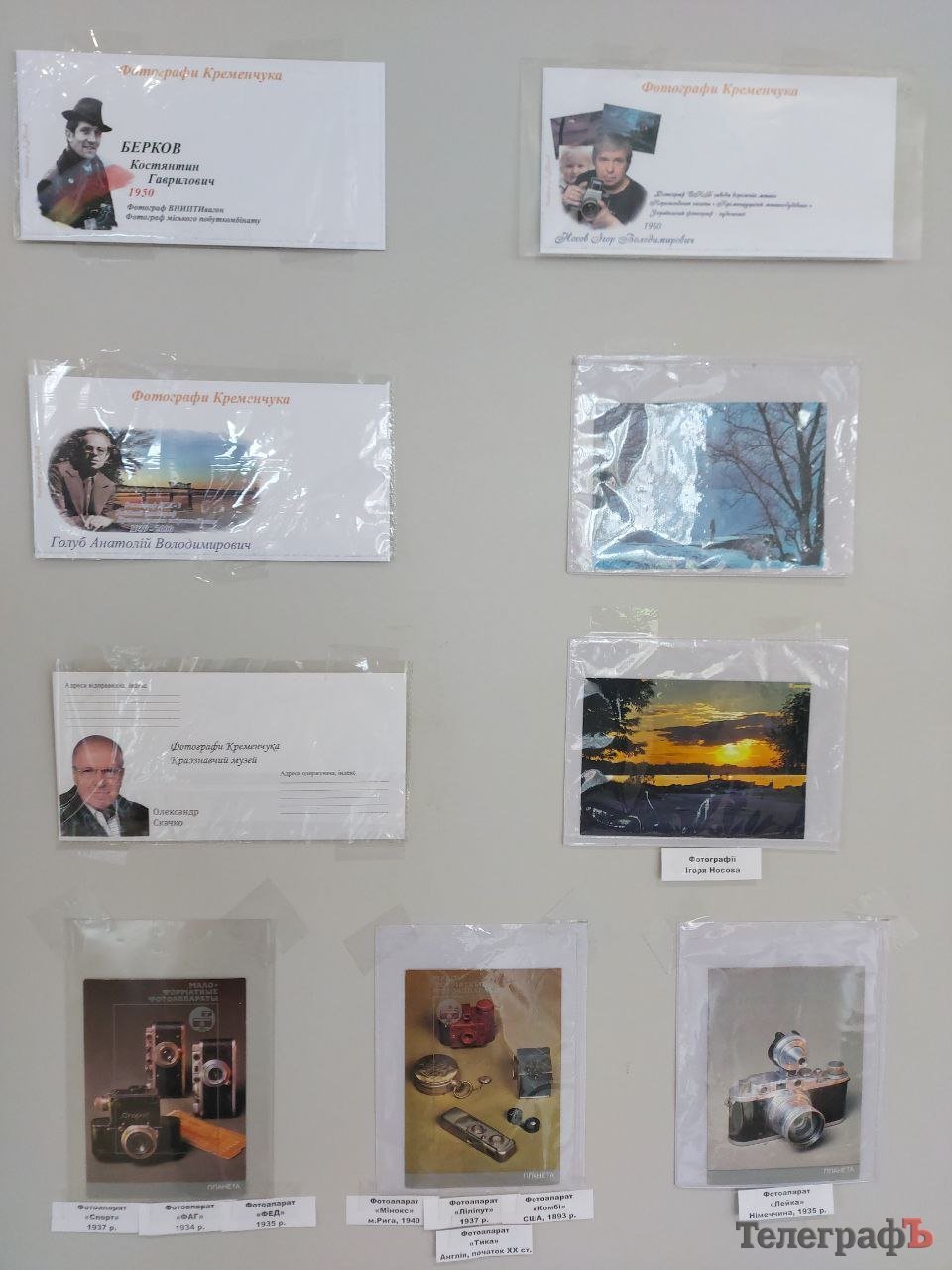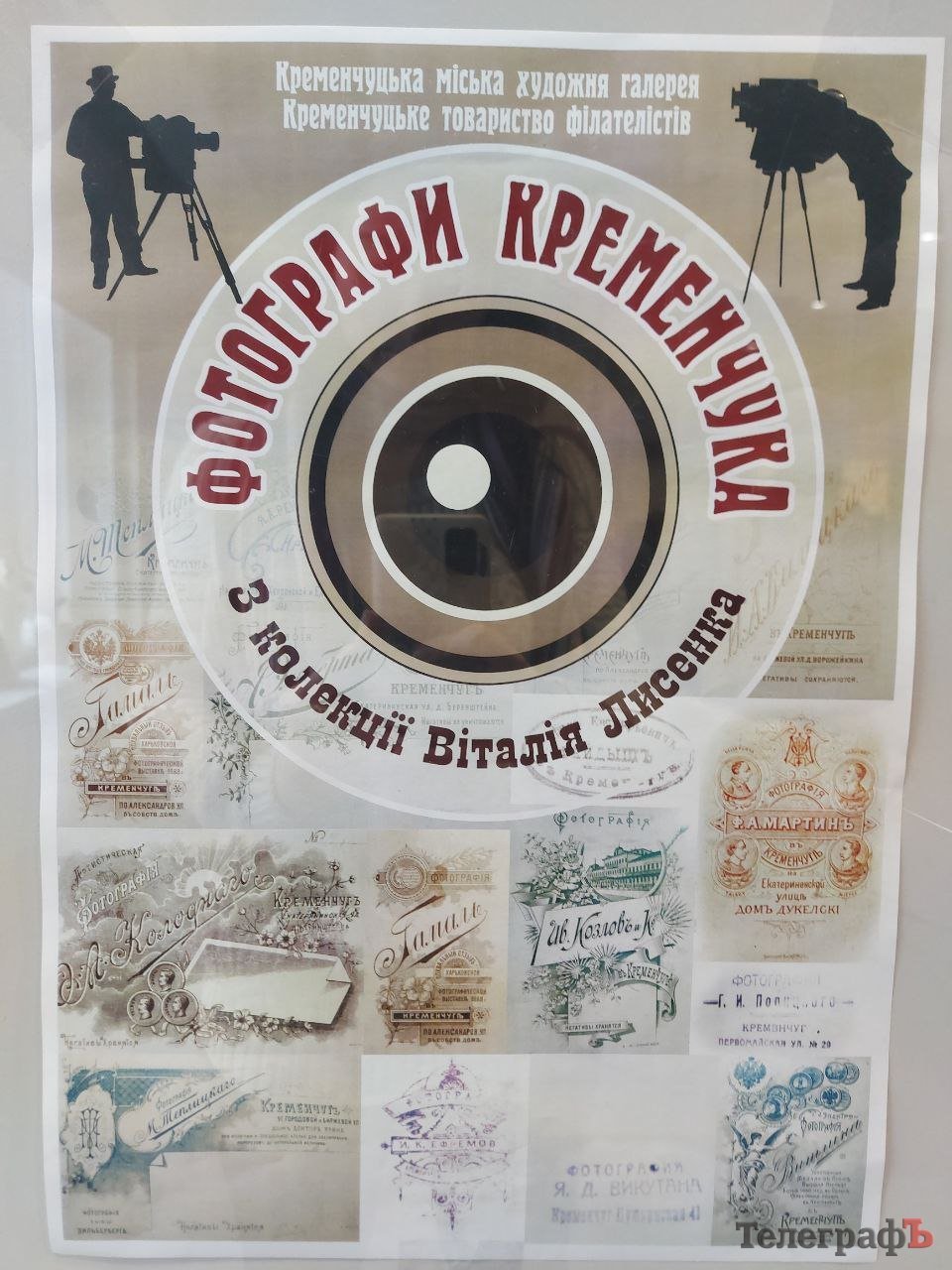 В експозиції зібрані роботи фотографів, які працювали у нашому місті у дореволюційний період (наприклад, є фото, яке датується 1868 роком) й у радянські часи. Більшість фотографій – з приватної колекції члена товариства філателістів Віталія Лисенка, який придбав їх на аукціонах. Також на виставці представлені поштівки й конверти з портретами фотографів Кременчука.