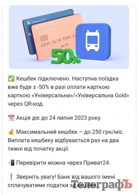 З 24 квітня до 24 липня кременчужани можуть отримати 50% кешбеку в разі оплати квитків карткою «ПриватБанку» «Універсальна»/«Універсальна Gold» через QR-коди, які розміщено у салонах комунальних тролейбусів і автобусів.