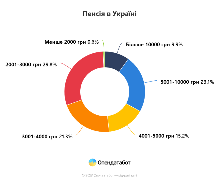 За перший квартал 2023 року середня пенсія в Україні склала 5 238 грн. У Полтавській області розмір середньої пенсії — 5097 грн. Найменша середня пенсія у Тернопільській області — 3997 грн, а найбільша у Києві — 7129 грн. Близько 30% пенсіонерів в Україні отримують менш ніж 3000 грн, а близько третини — середню та вищу пенсію.