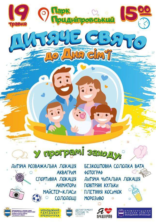 19 травня з 15.00 до 18.00 у Придніпровському парку (біля літньої сцени) відбудеться вуличне дитяче свято до Дня сім’ї. Про це повідомляє молодіжний парламент Кременчука.