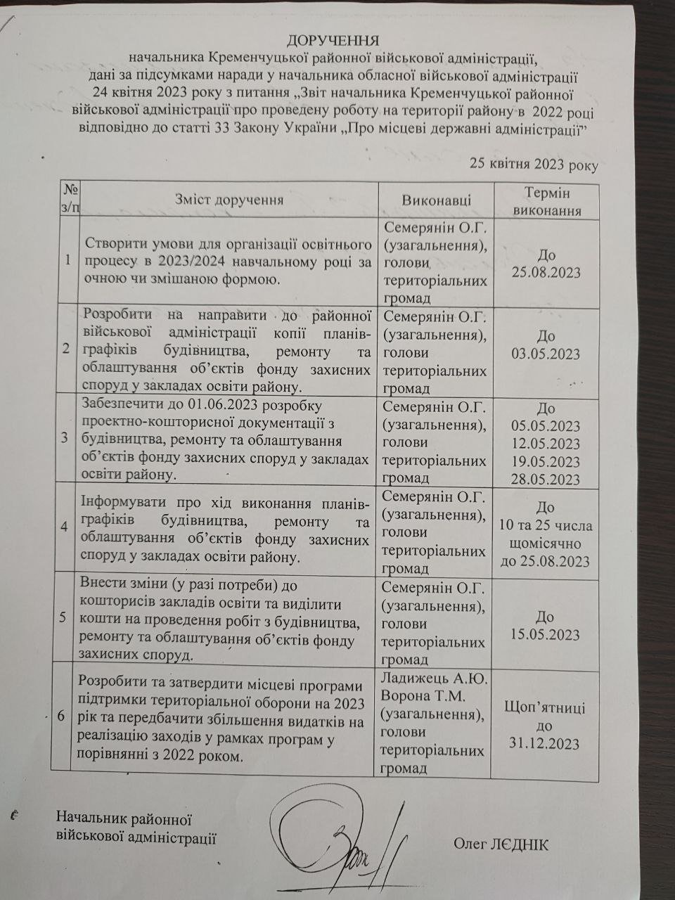 Начальник Кременчуцької районної військової адміністрації надав доручення керівникам територіальних громад району та встановив чіткий графік підготовки та звітності щодо проведеної роботи з підготовки закладів освіти до проведення освітнього процесу у новому навчальному році в очному або змішаному режимі.