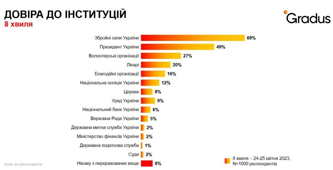 При цьому 8% респондентів заявили, що не довіряють жодній із зазначених інституцій.
