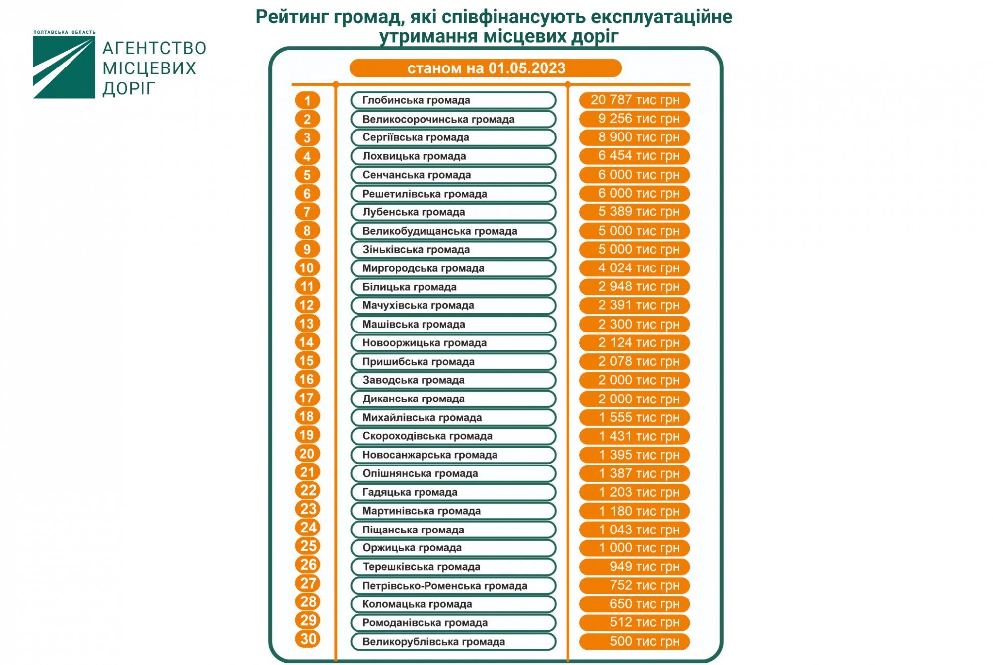 На сторінці Агентства місцевих доріг опублікований рейтинг з 30 громад, де зазначені суми співфінансування. Кременчуцької громади у цьому переліку немає.