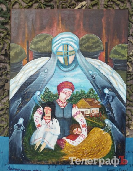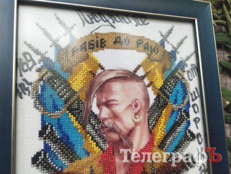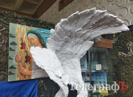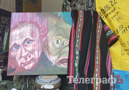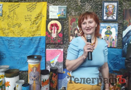 «Кременчуцький Телеграф» розпочав огляд виставки з робіт зі стенду, де представлені роботи від команди волонтерки Євгенії Хоменко.