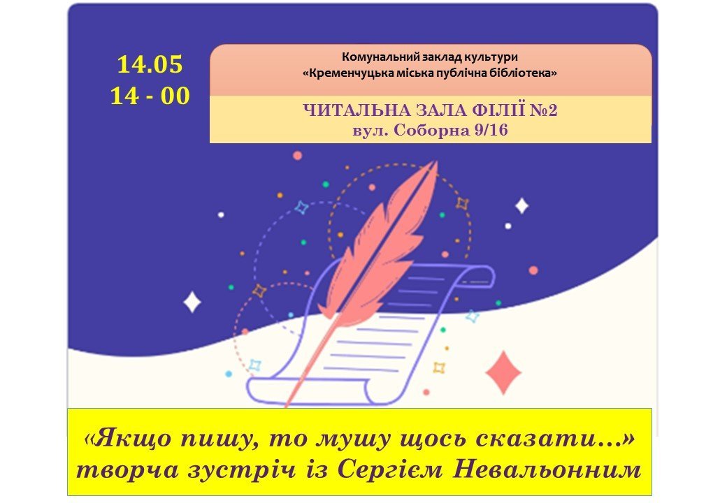 У Неділю, 14 травня, о 14.00 у читальній залі бібліотеки-філії №2 на Соборній, 9/16 відбудеться творча зустріч із Сергієм Невальонним «Якщо пишу, то мушу щось сказати».