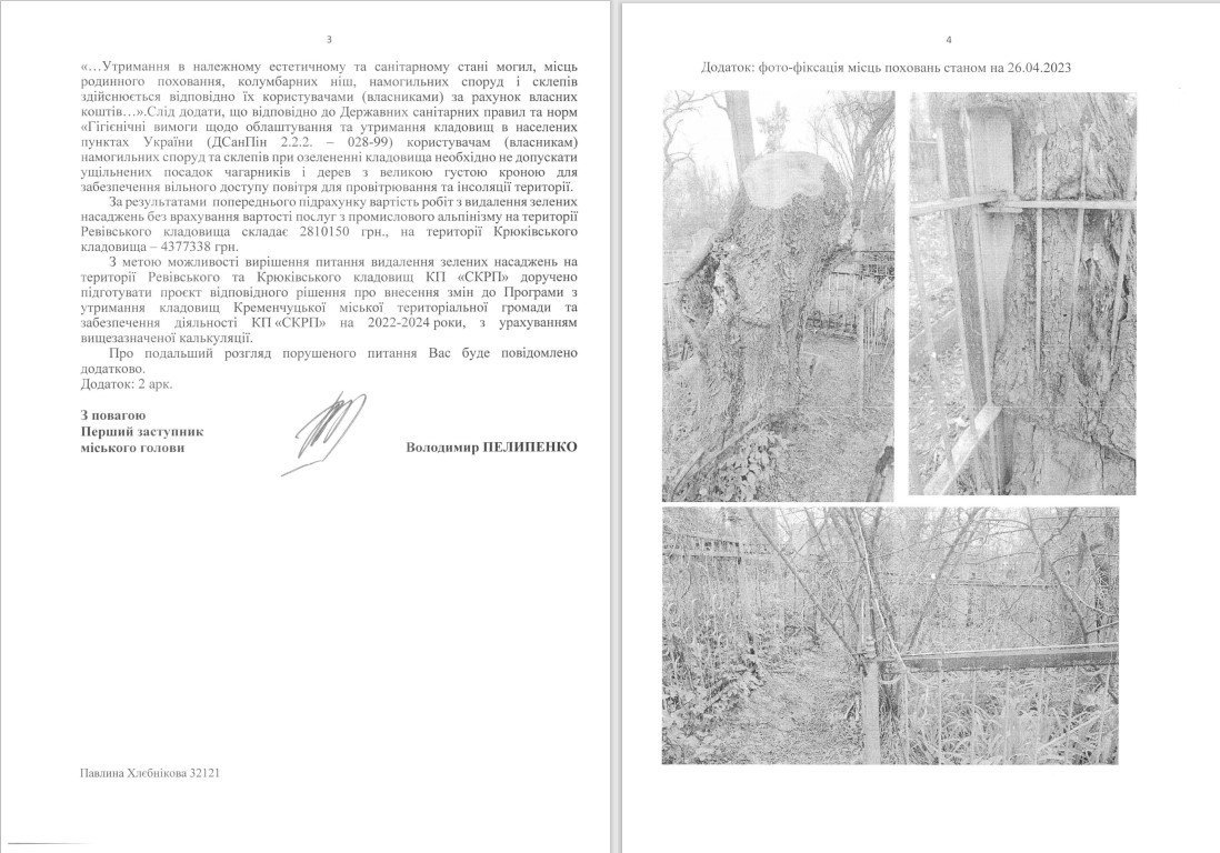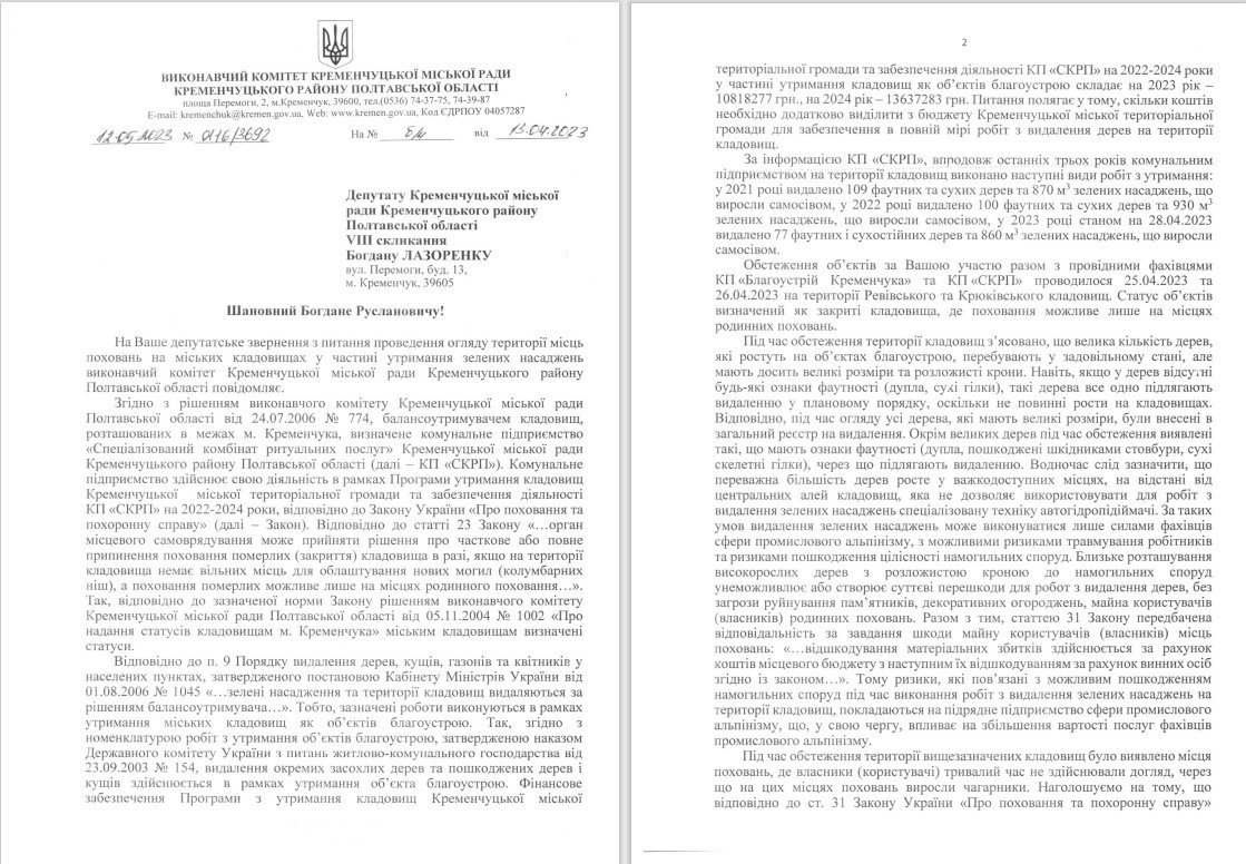 У своєму запиті депутат Лазоренко виклав численні скарги мешканців Кременчука, що стосувалися жахливого стану закритих кладовищ в частині великої кількості аварійних дерев. Як зазначається в документі: дерева-велетні становлять загрозу не лише цілісності надмогильної архітектури, а життю та здоров’ю відвідувачів, що приходять віддати шану спочилим родичам. Так згідно п.9 постанови Кабінету Міністрів України №1045 від 01.08.2006 «… зелені насадження на території кладовищ видаляються за рішенням балансоутримувача…». Своєю чергою, відповідно до рішення виконавчого комітету Кременчуцької міської ради №774 від 24.07.2006 балансоутримувачем кладовищ розташованих в межах м. Кременчука, визначене комунальне підприємство «Спеціальний комбінат ритуальних послуг».