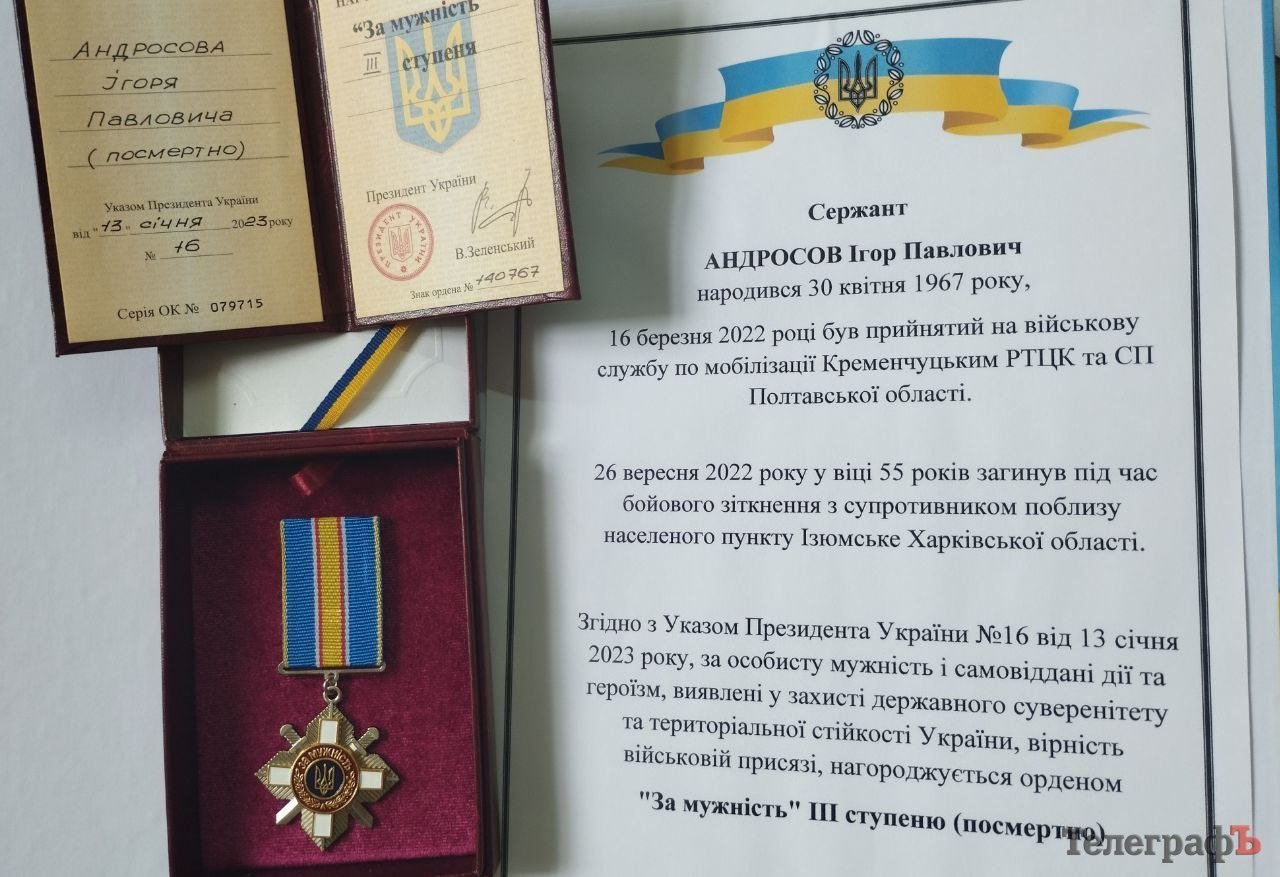 Сьогодні, 15 травня, дружина загиблого захисника Ігоря Андросова Тетяна отримала орден «За мужність» ІІІ ступеня. Вручення нагороди відбулося у стінах Кременчуцького РТЦК та СП (раніше військкомат).