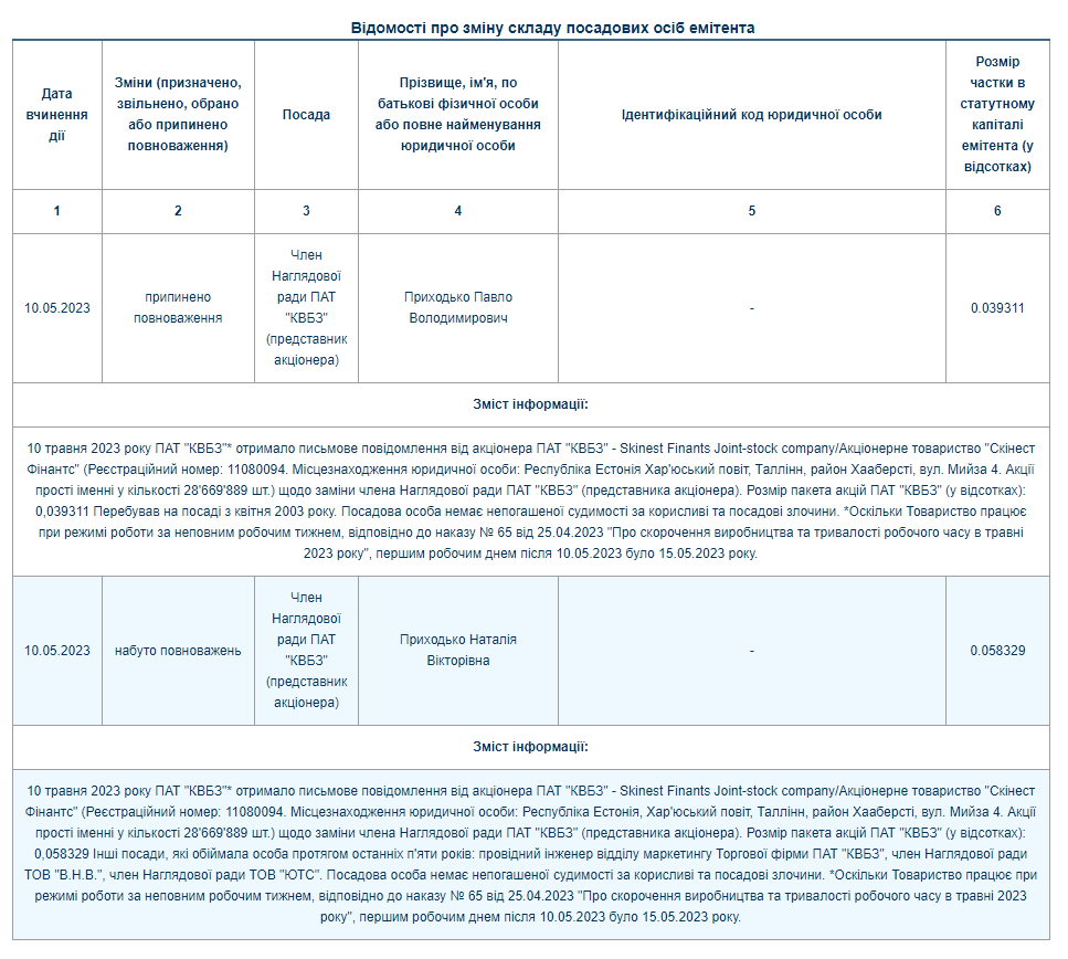 Так, ПАТ «КВБЗ» отримало письмове повідомлення від акціонера Skinest Finants Joint-stock соmраnу/Акцiонерне товариство «Скiнест Фiнантс» (Республiка Естонiя) щодо заміни члена Наглядової ради ПАТ Приходька Павла Володимировича. Його розмір частки в статутному капіталі складав 0.039311%