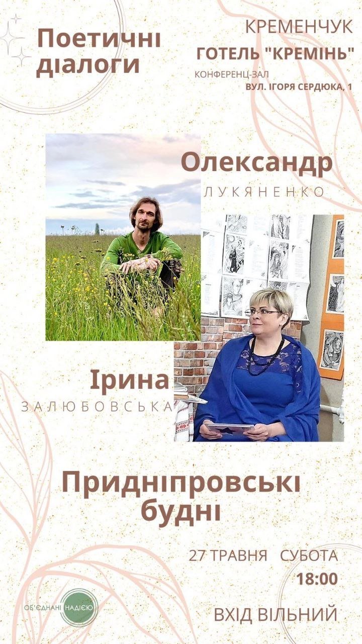 Усіх охочих запрошують на зустріч із кременчуцькою поеткою Іриною Залюбовською та полтавським письменником Олександром Лук’яненком.