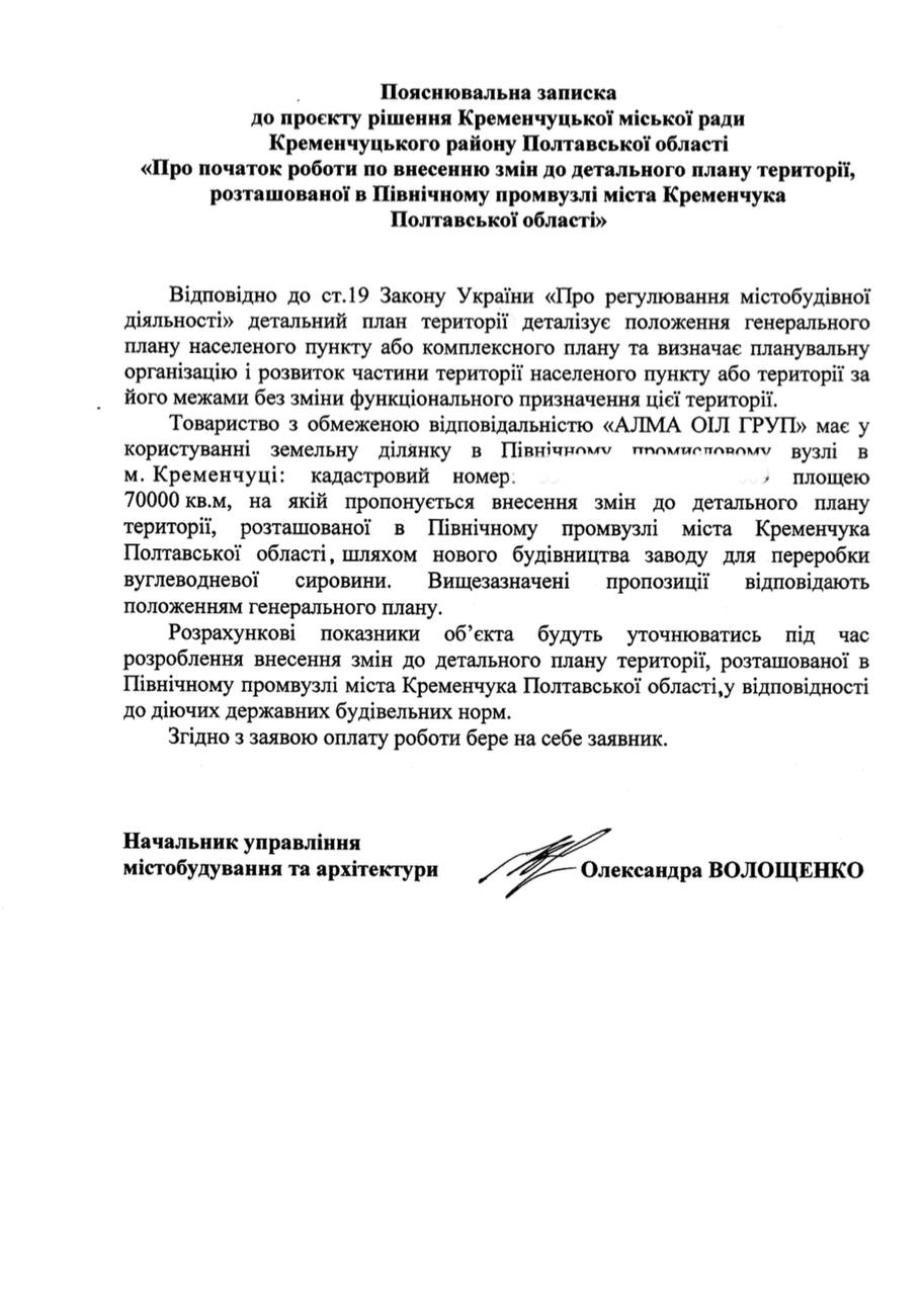 Таке собі товариство ТОВ «АЛМА ОІЛ ГРУП» має в користуванні земельну ділянку площею 70 тисяч квадратних метрів, на якій планується збудувати завод для переробки вуглеводної сировини. Простими словами — це нафта, природний газ (у тому числі нафтовий (попутний) газ, газ (метан) вугільних родовищ, газ сланцевих товщ, газ центрально-басейнового типу, газ колекторів щільних порід), газовий конденсат.