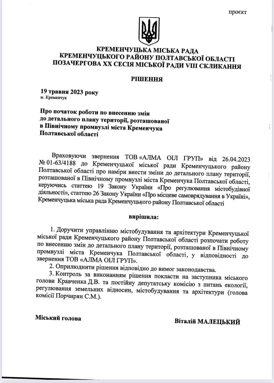 Неприємним сюрпризом для мене стало сесійне питання, яке є першою цеглиною в питанні будівництва нового нафтопереробного заводу на території північного промислового вузла. Сьогодні депутати дадуть дозвіл на початок робіт по внесенню змін до детального плану території, розташованої в північному промвузлі міста Кременчука Полтавської області.
